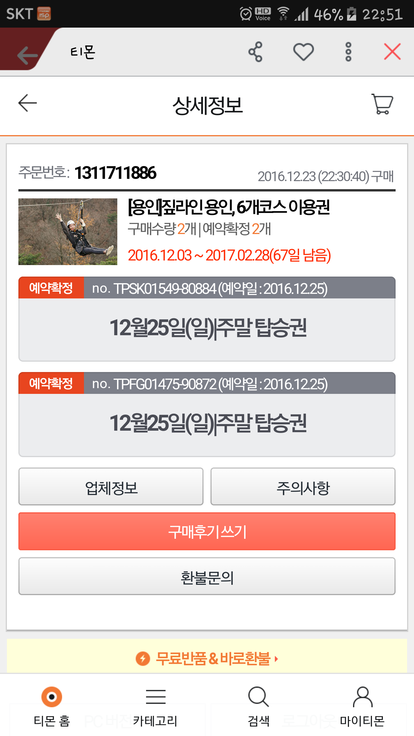 • 티몬으로 구매했습니다. 12월 25일 오전 10:00시 2명 예약합니다. 예약자 박완희 입니다.